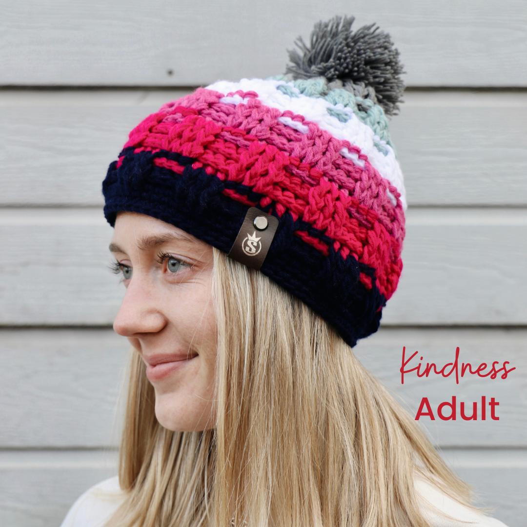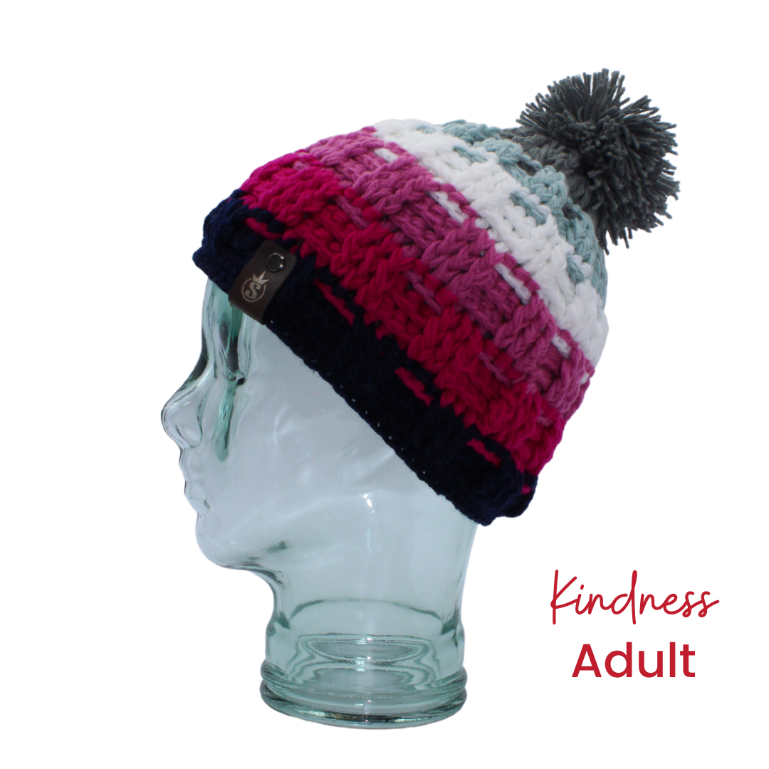 - Kindness Design: dark blue, dark pink, light pink, white, and gray panels with a gray pompom
