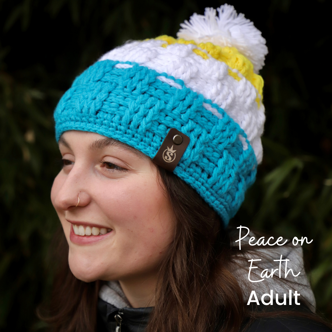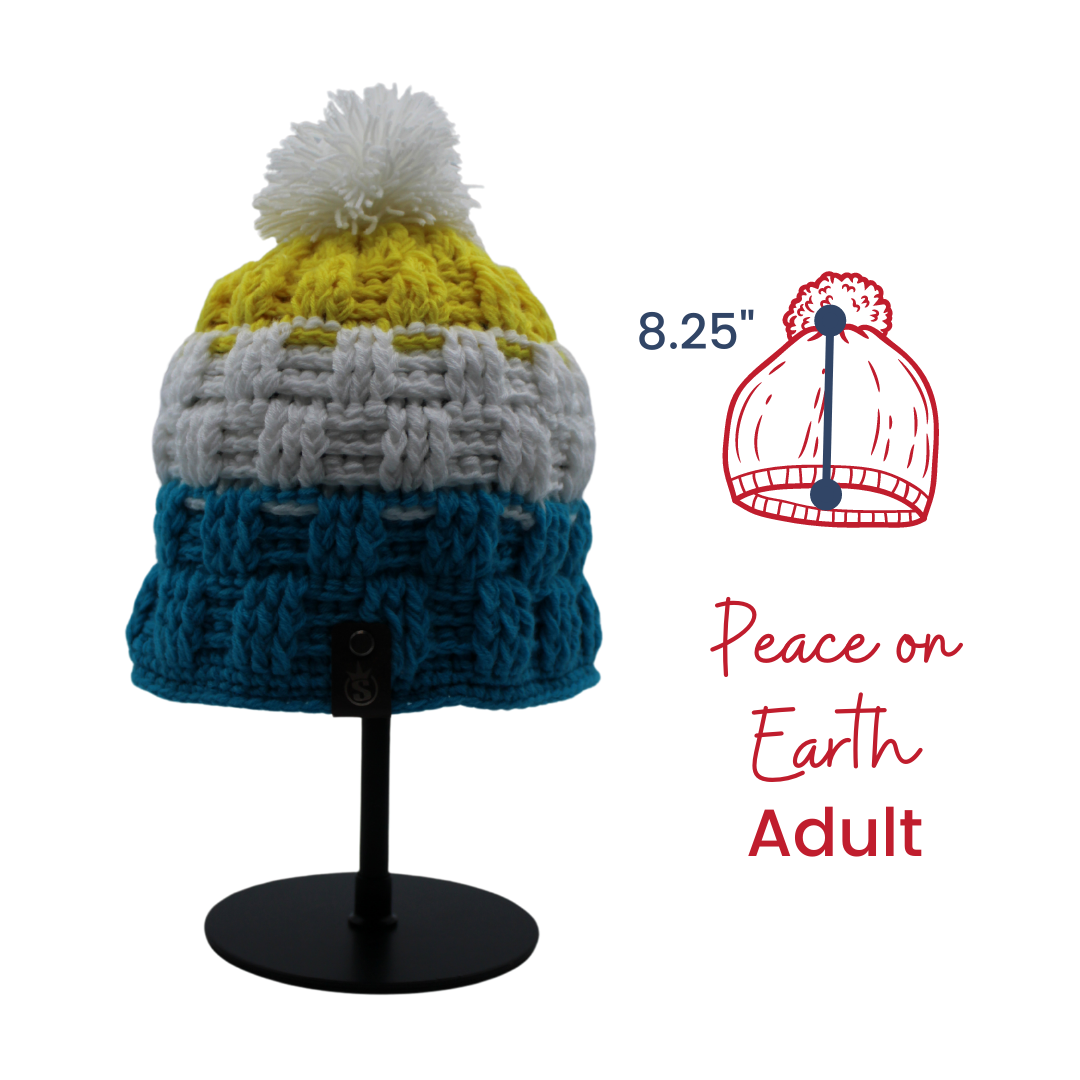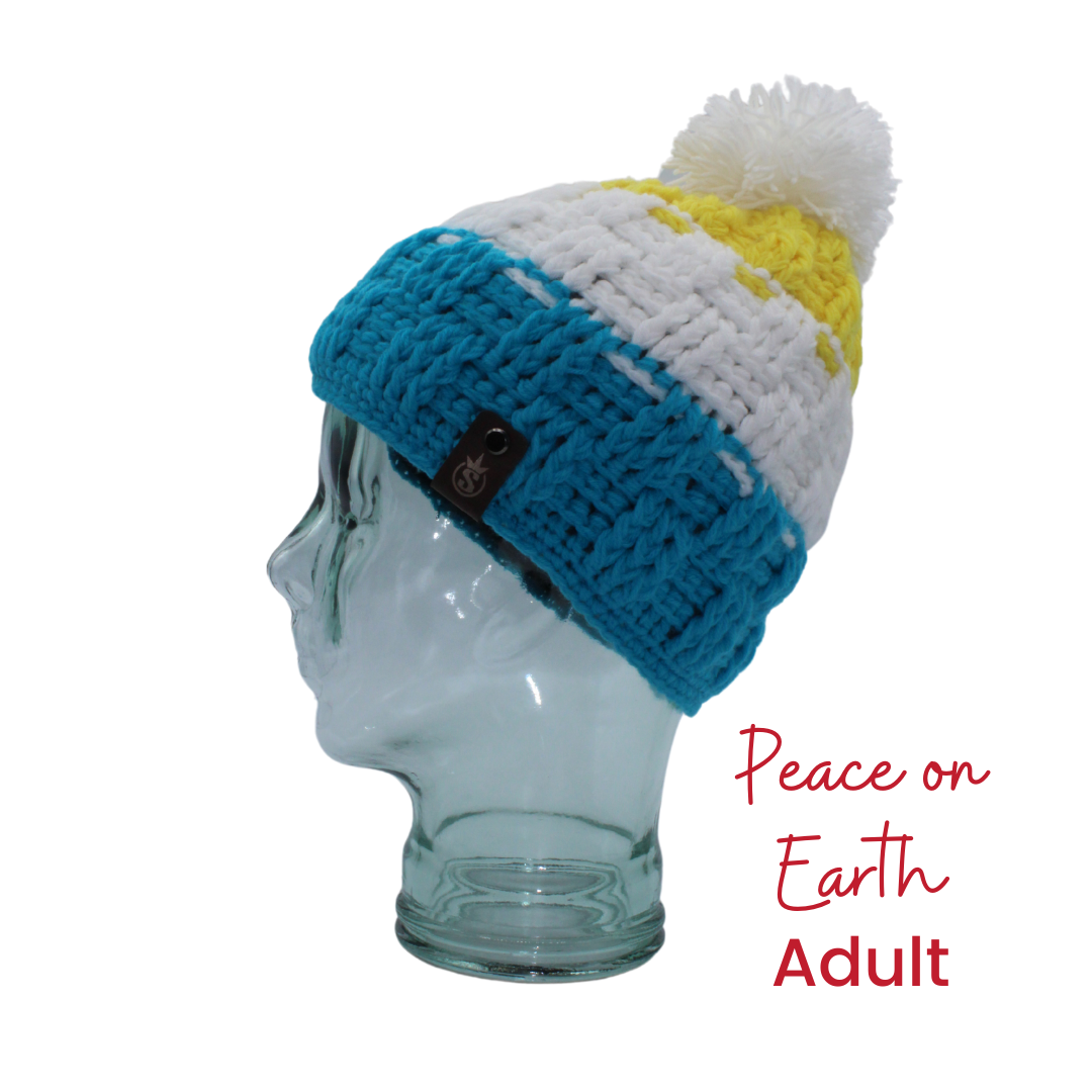 Peace on Earth is a beanie designed in solidarity with the people of Ukraine and in support of their war efforts while under siege by Russia.