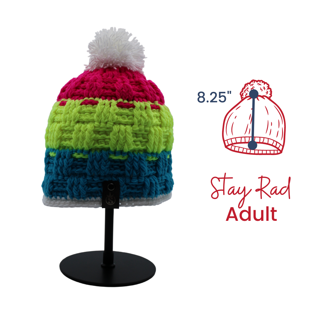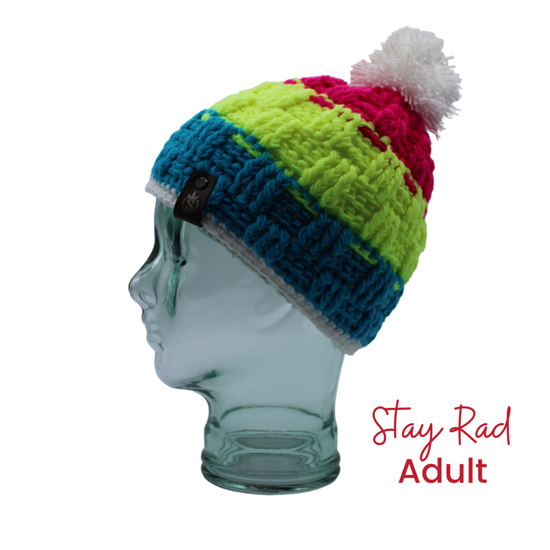 - Stay Rad Design: white with neon blue, yellow, & pink panels, topped with a white pompom - totally rad!